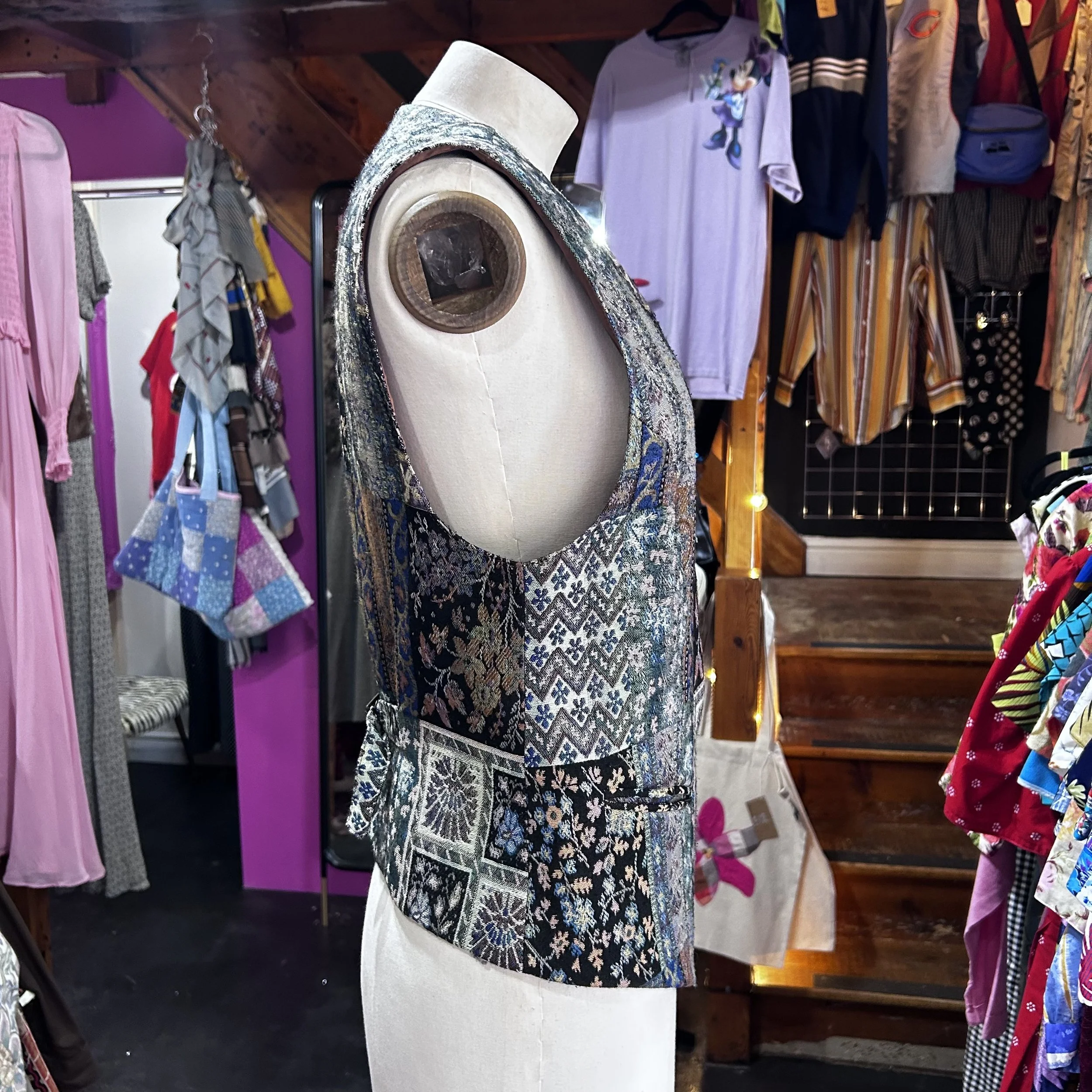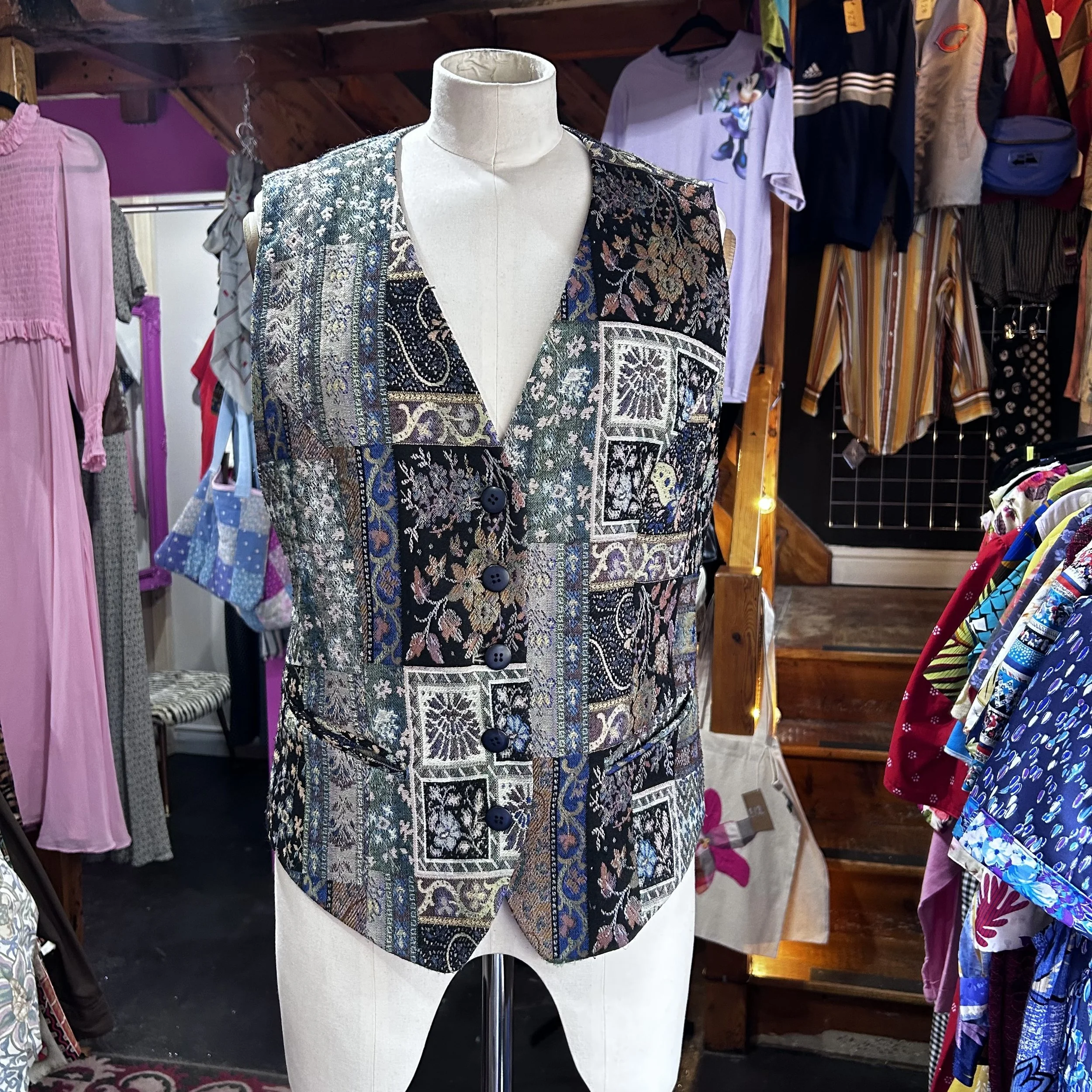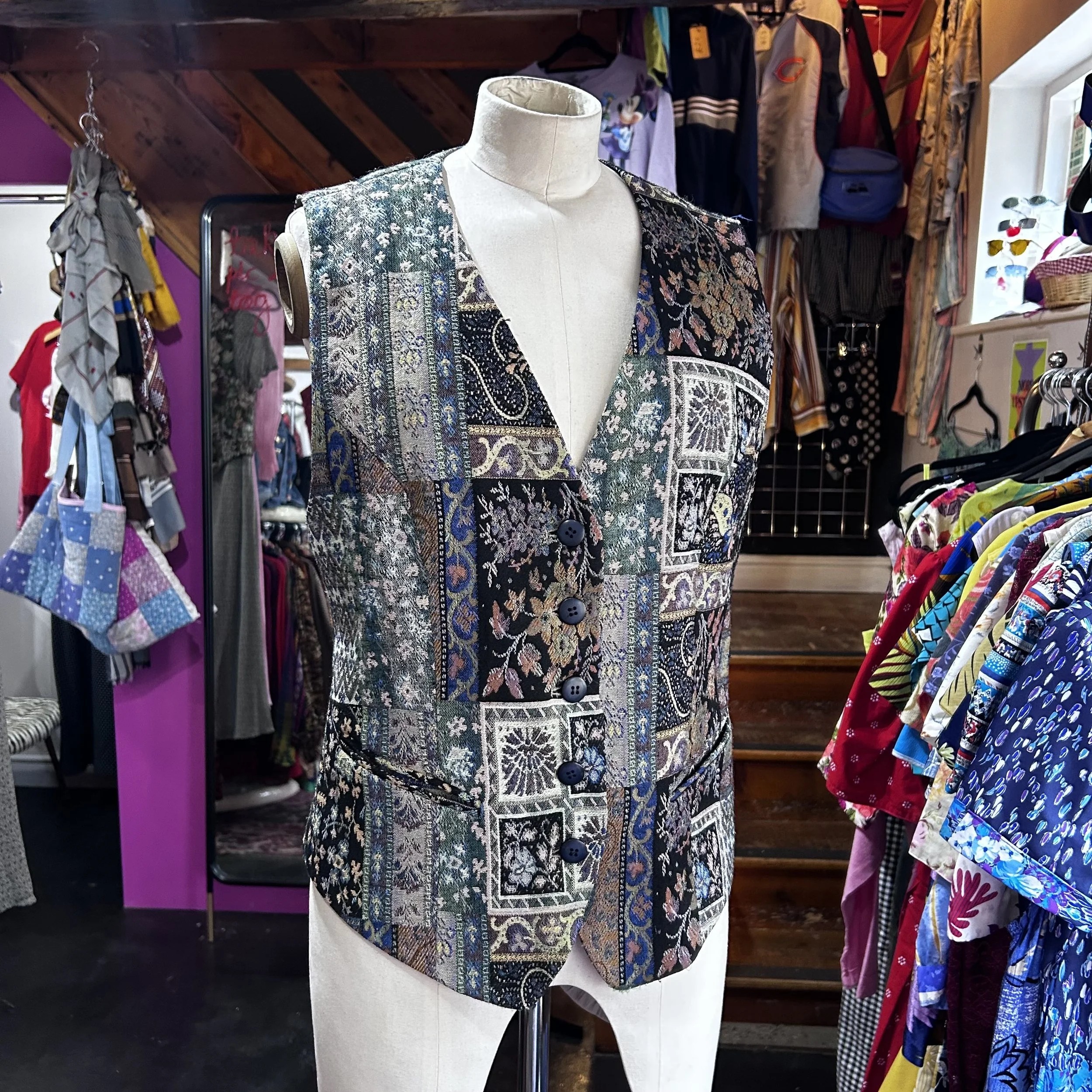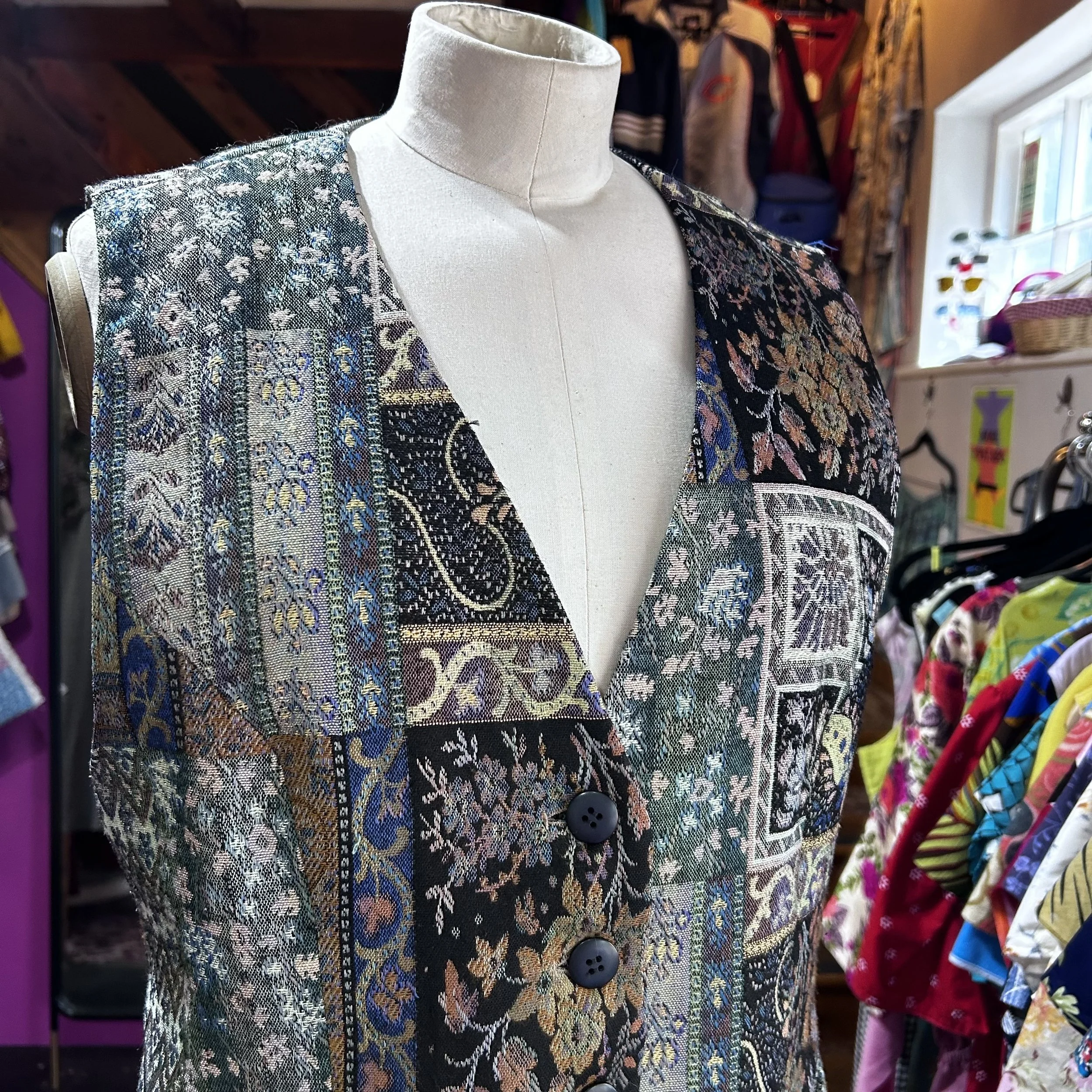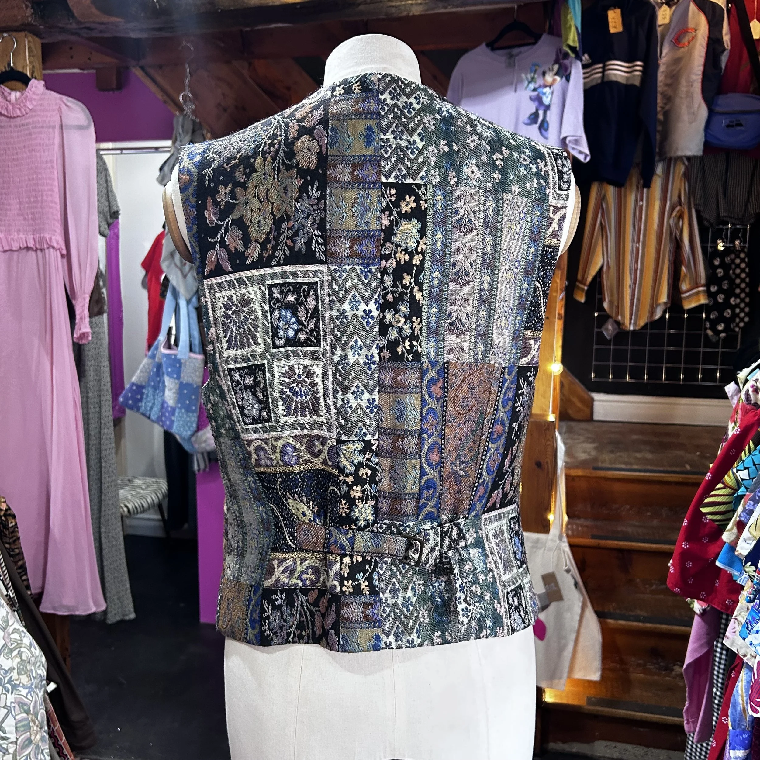 Unique vintage tapestry waistcoat featuring an intricate patchwork of floral and geometric patterns in earthy tones with hints of green, blue, and brown. Tailored with a button front and an adjustable back strap for the perfect fit.