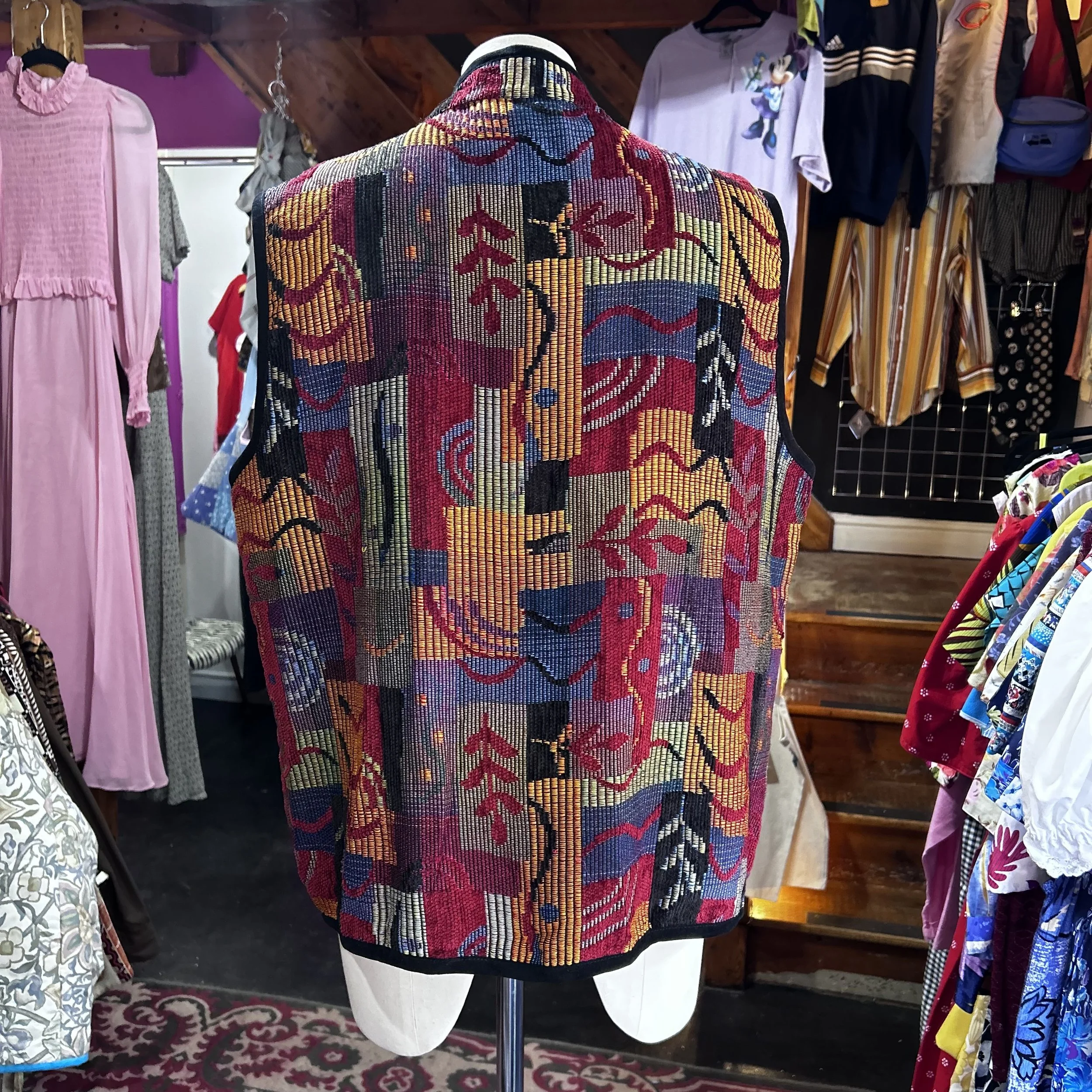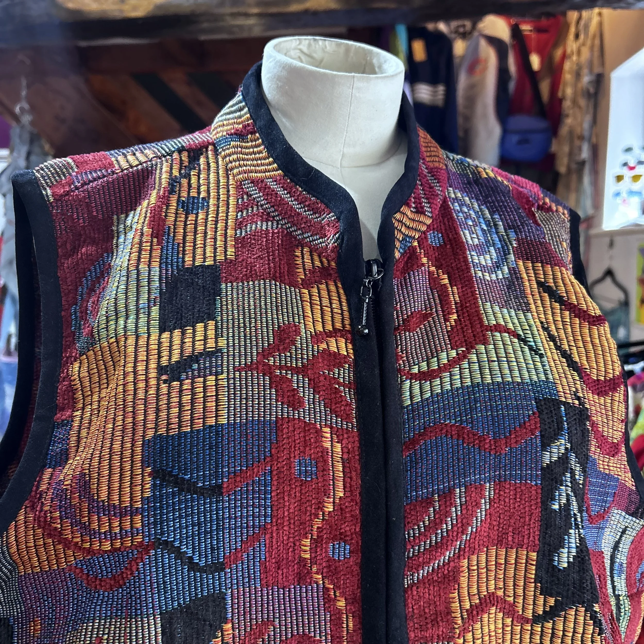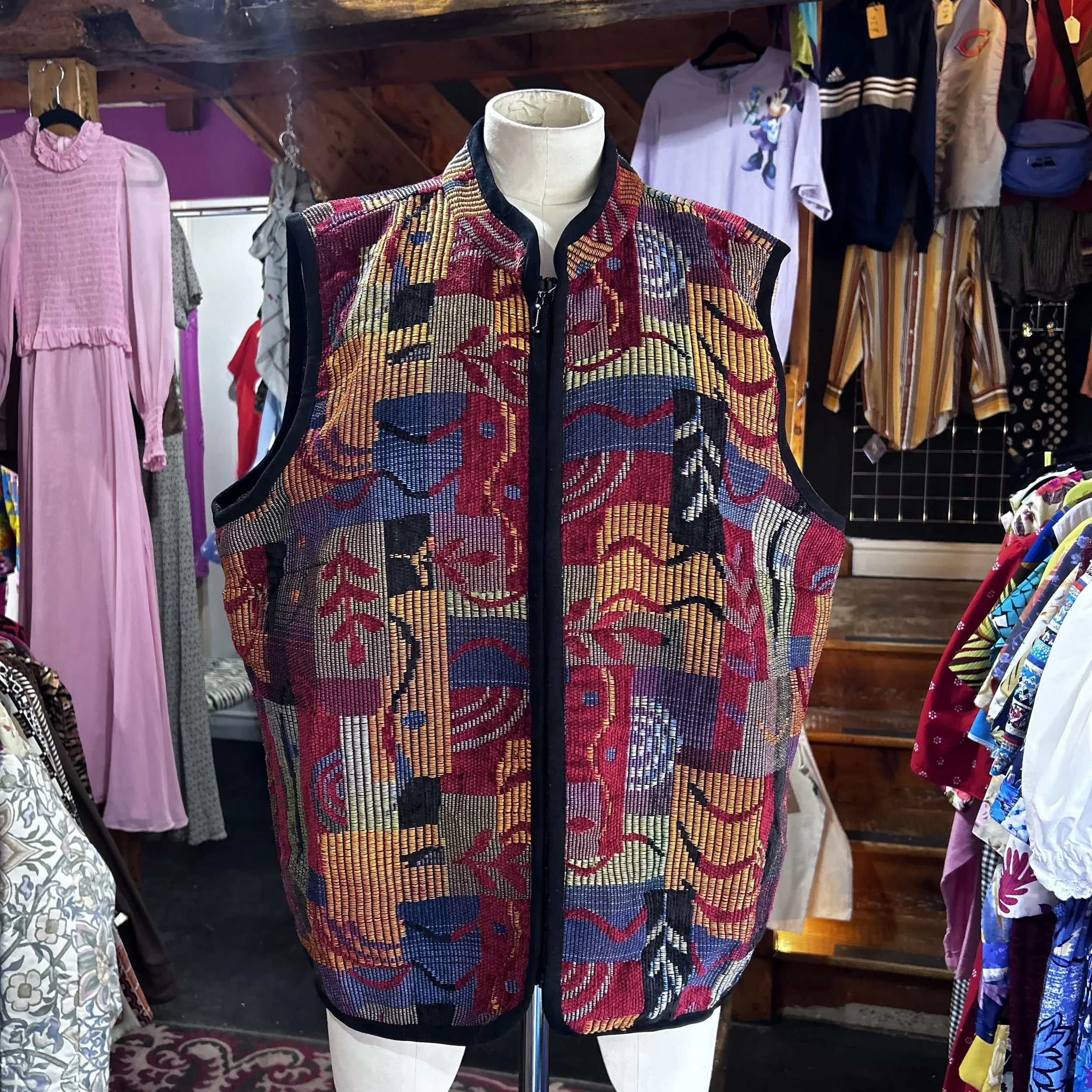 Striking vintage zip front tapestry waistcoat in a bold abstract geometric design, featuring rich tones of red, gold, navy, and purple.