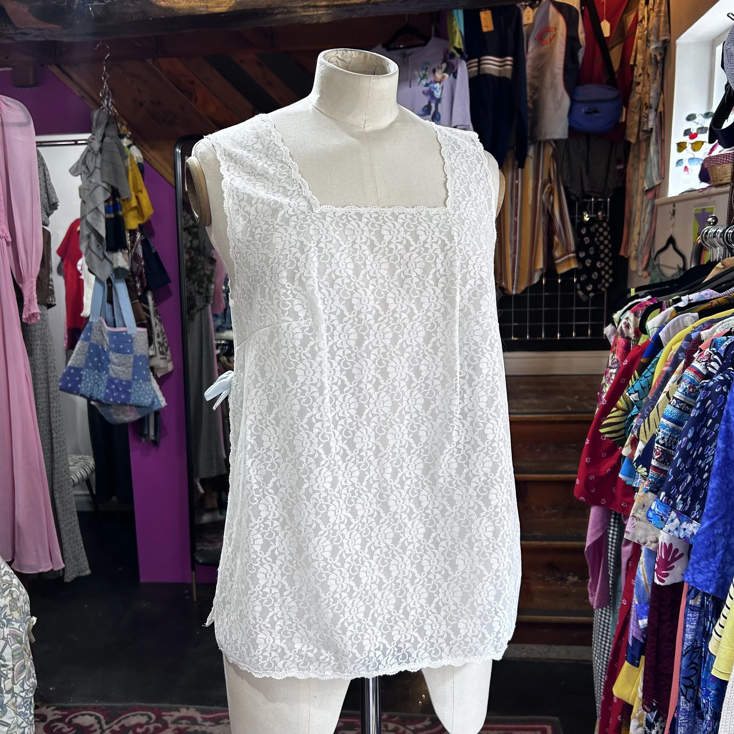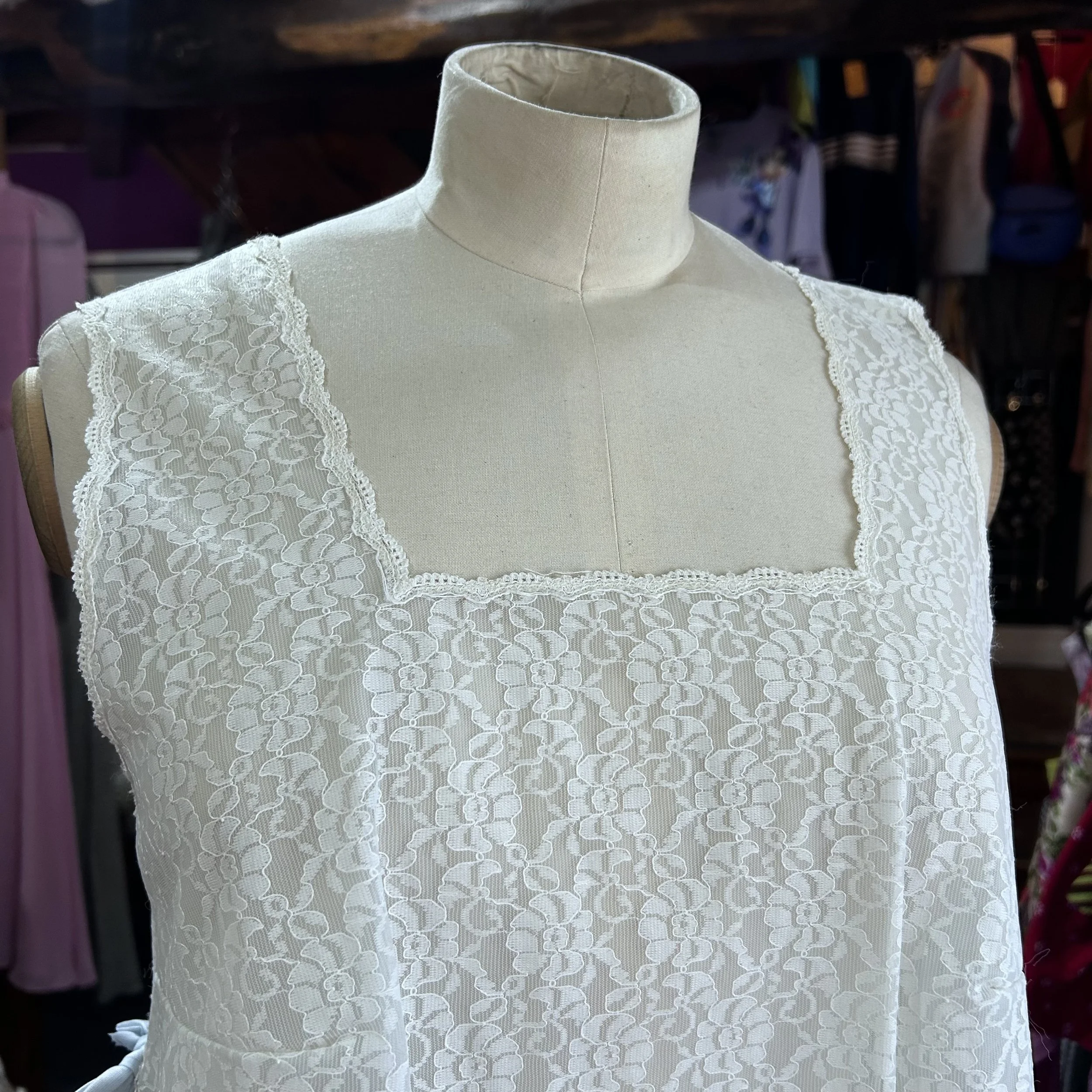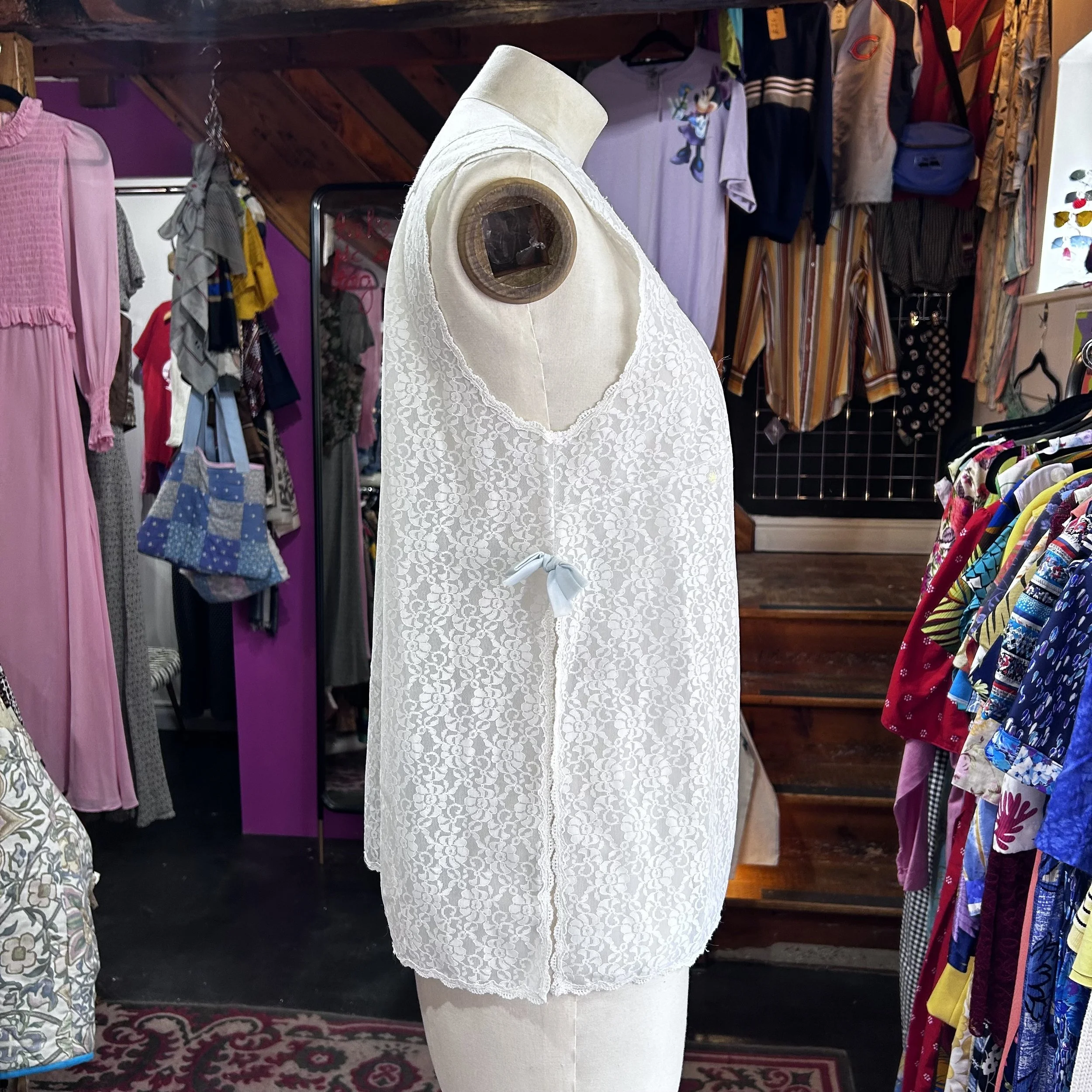 Delicate vintage white lace blouse from the 1970s, featuring a feminine square neckline and sleeveless cut. The sides feature sweet pale blue ribbon bows for a soft romantic touch. Lightweight and versatile.