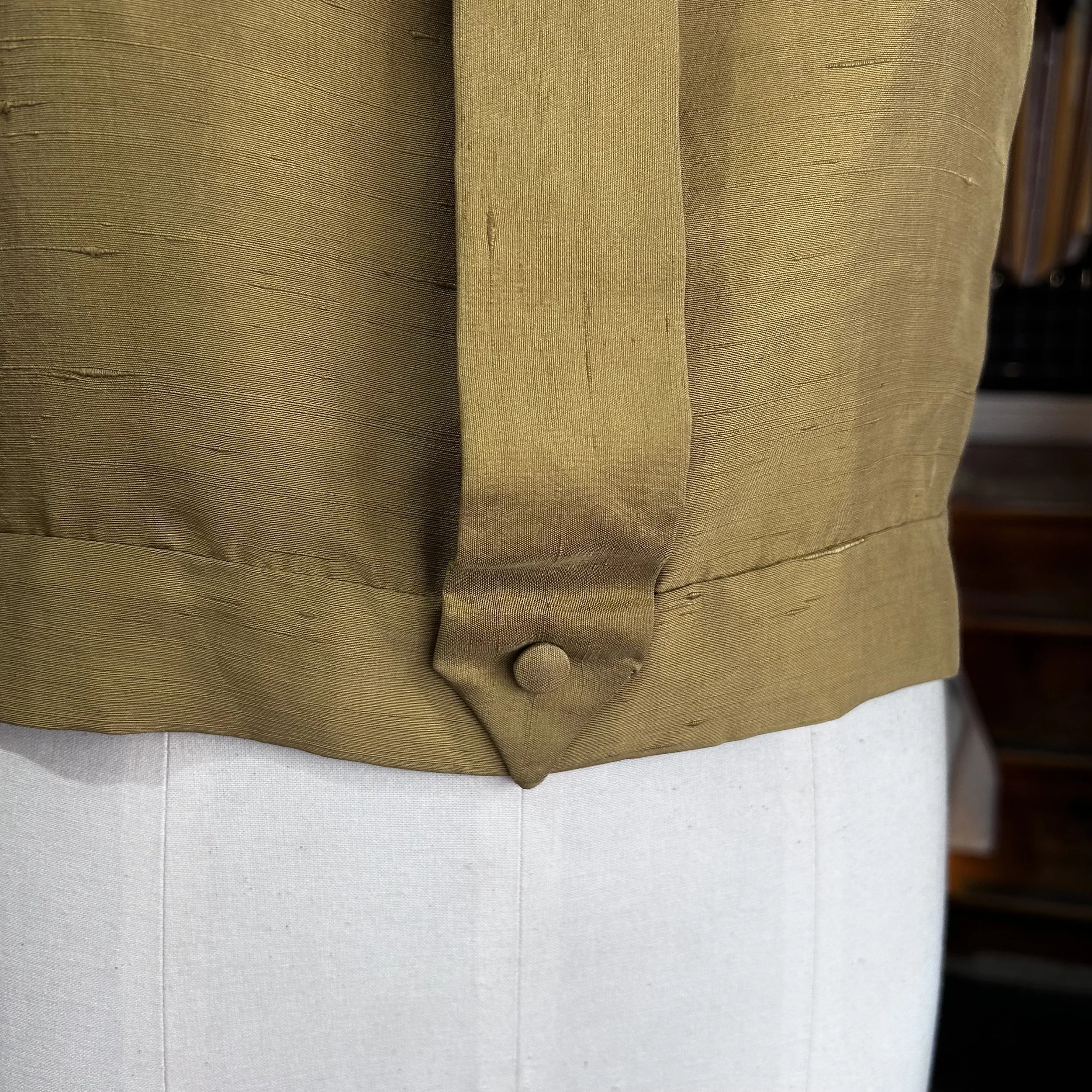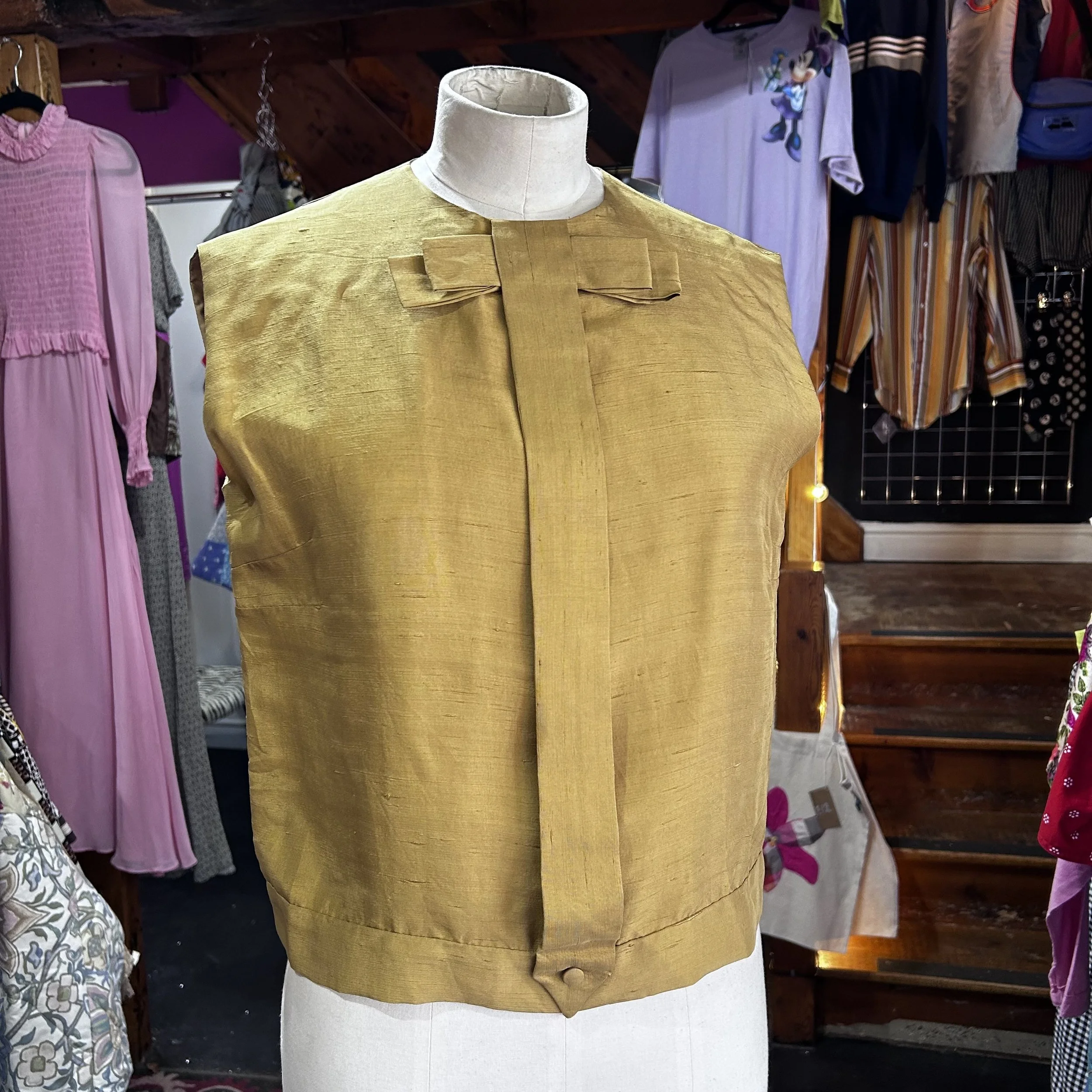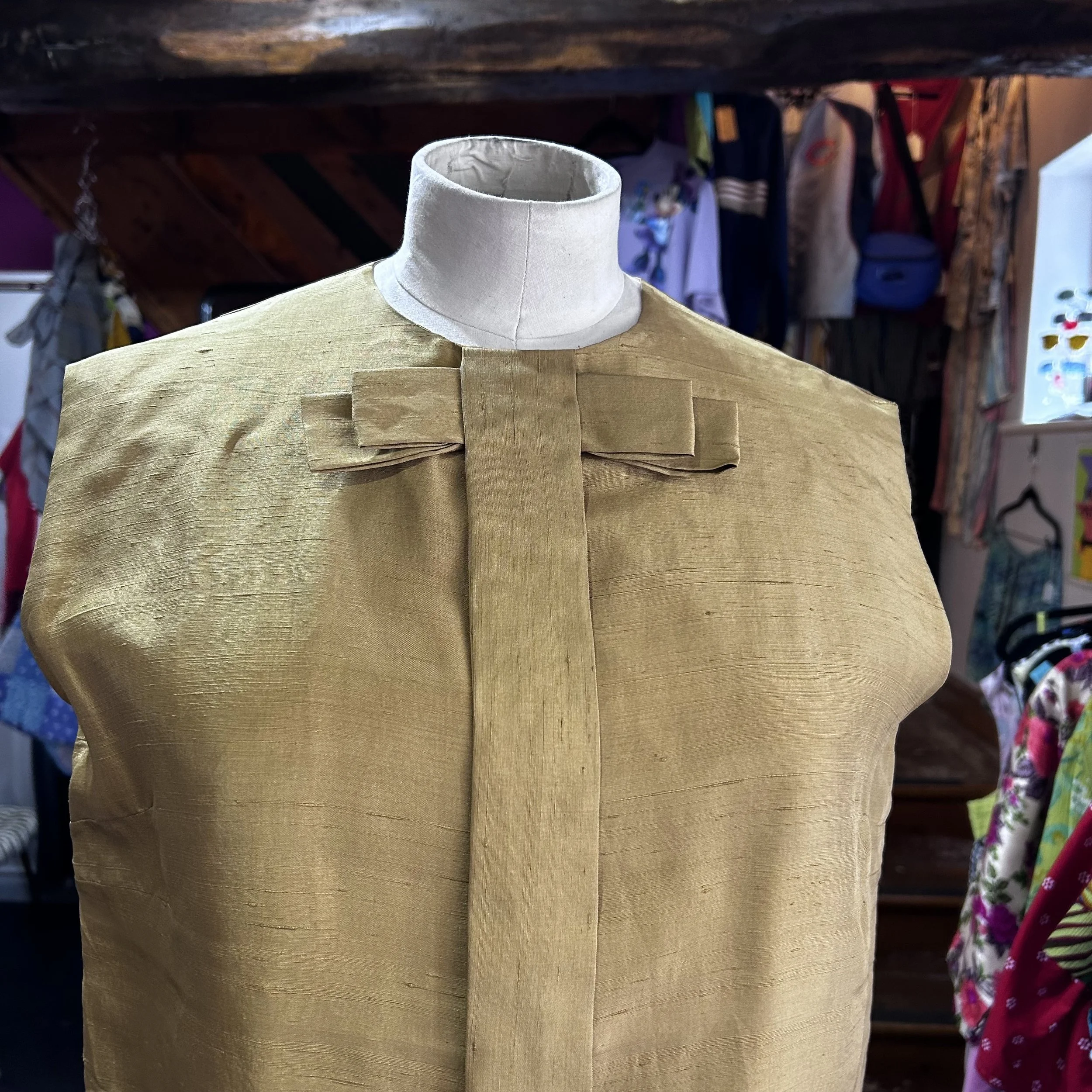 Rare 1960s couture sleeveless top by Janine Martin, crafted in mustard silk. The design features a sharp square bow at the neckline with a vertical panel running down the centre, finished with a covered button at the hem. The back fastens with a row of matching fabric-covered buttons. Fully lined for structure and elegance.