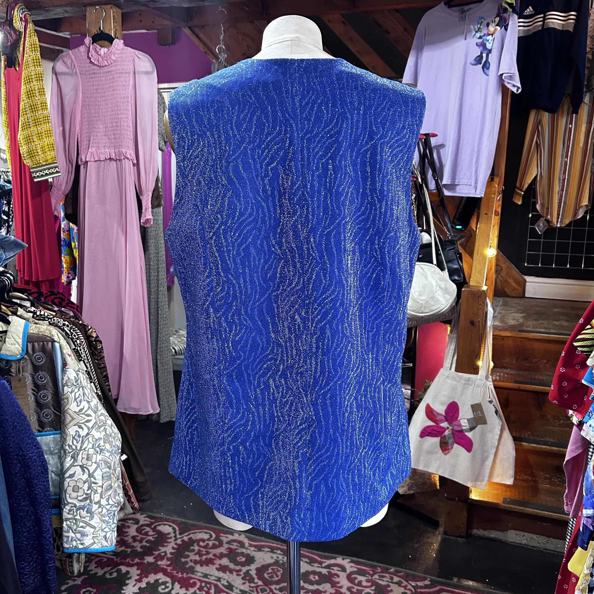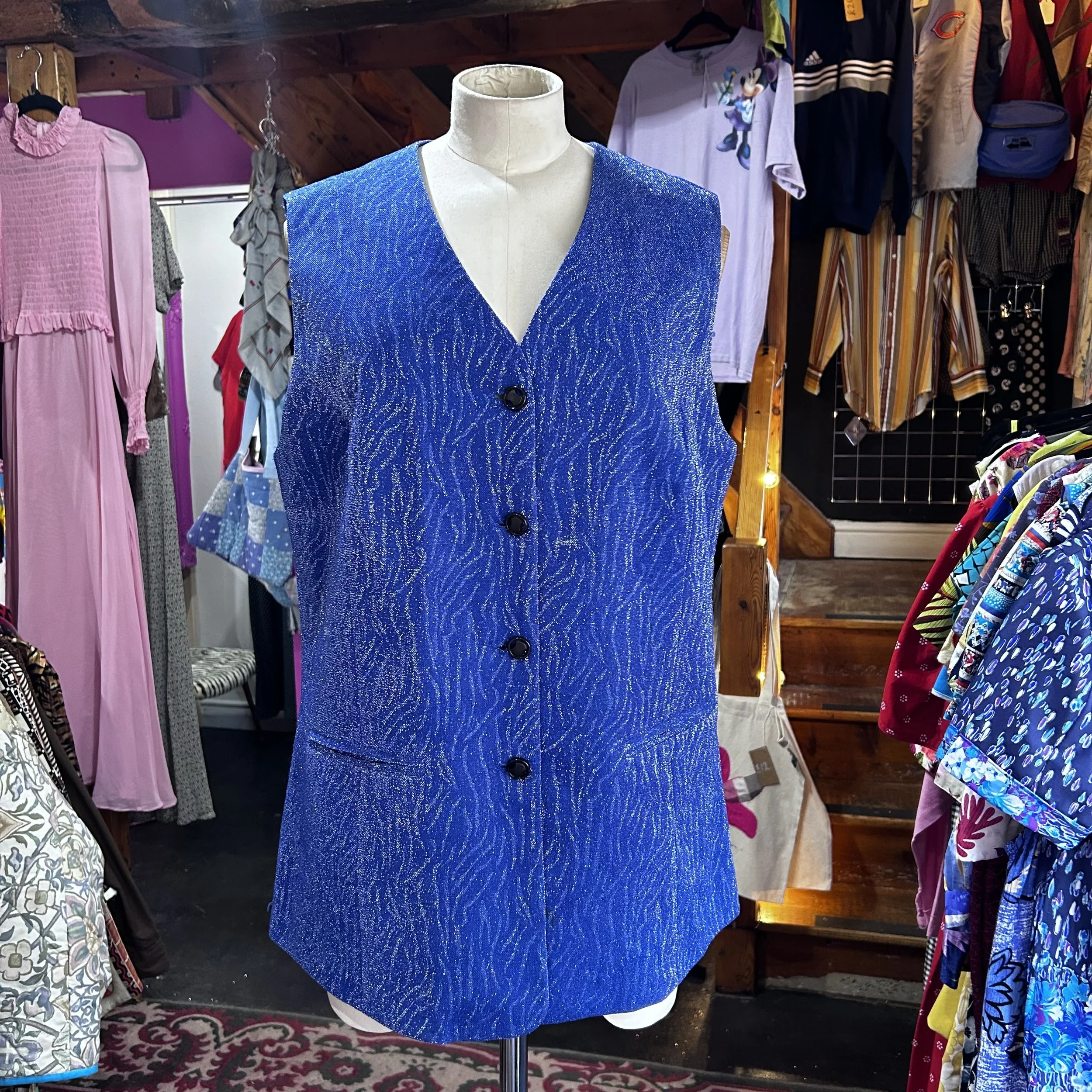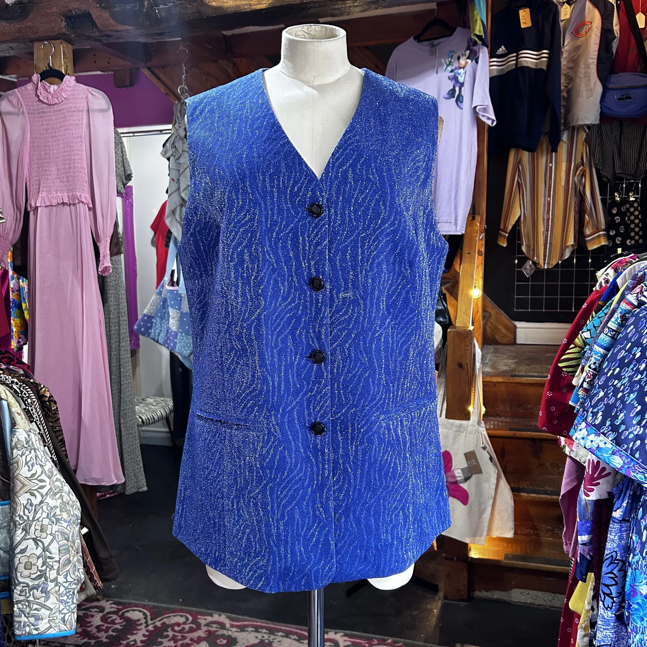 Striking vintage 70s waistcoat in a vivid cobalt blue with metallic silver thread woven throughout for a shimmering finish.