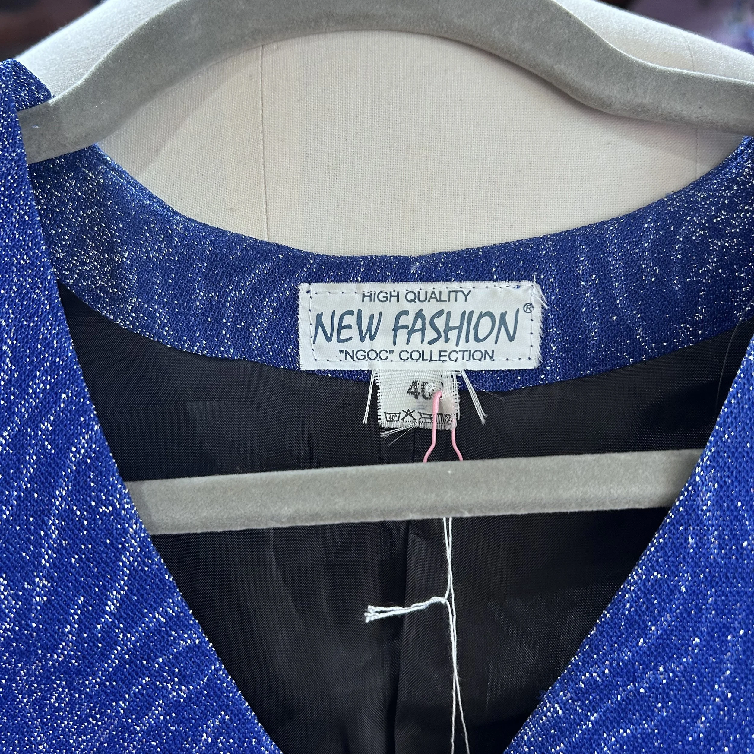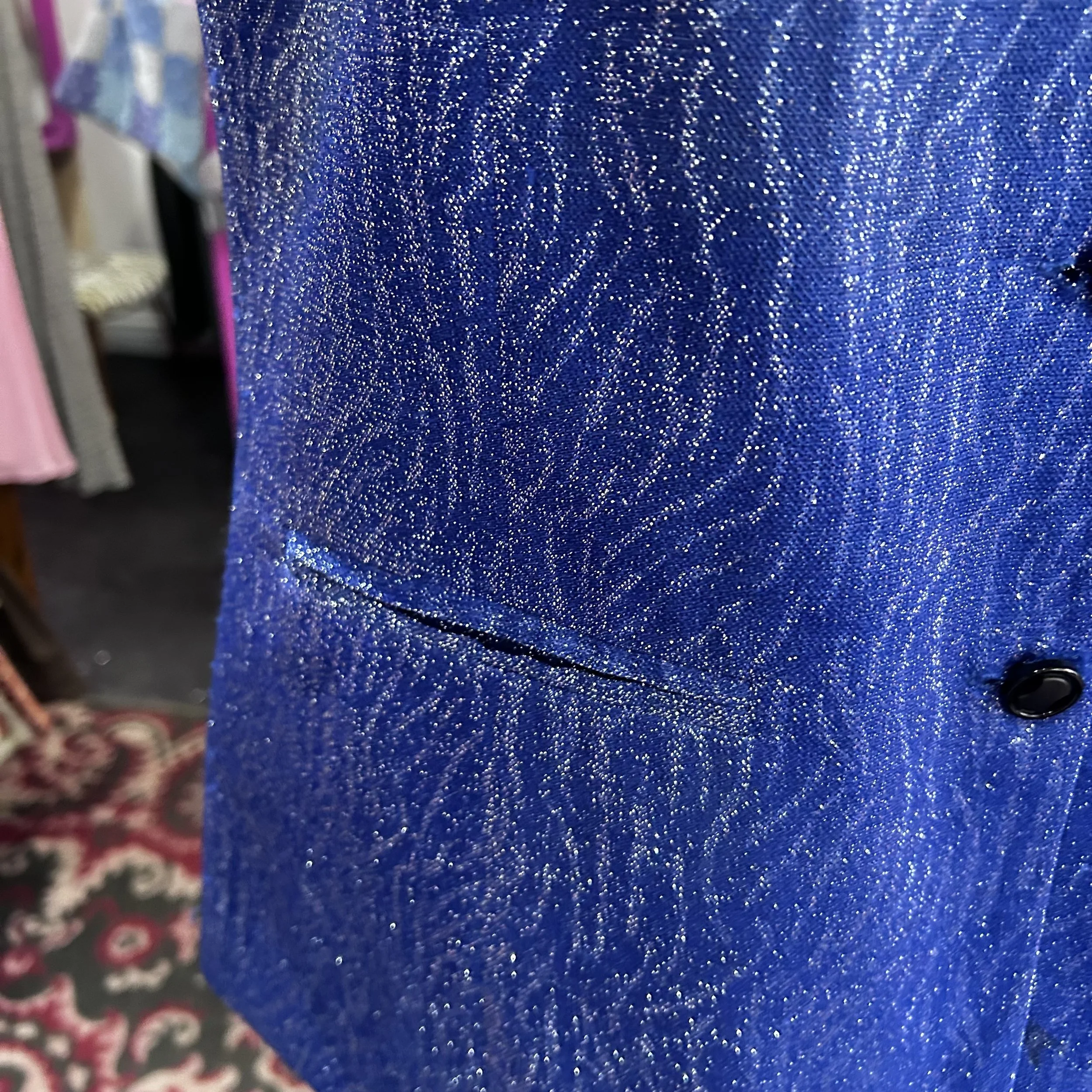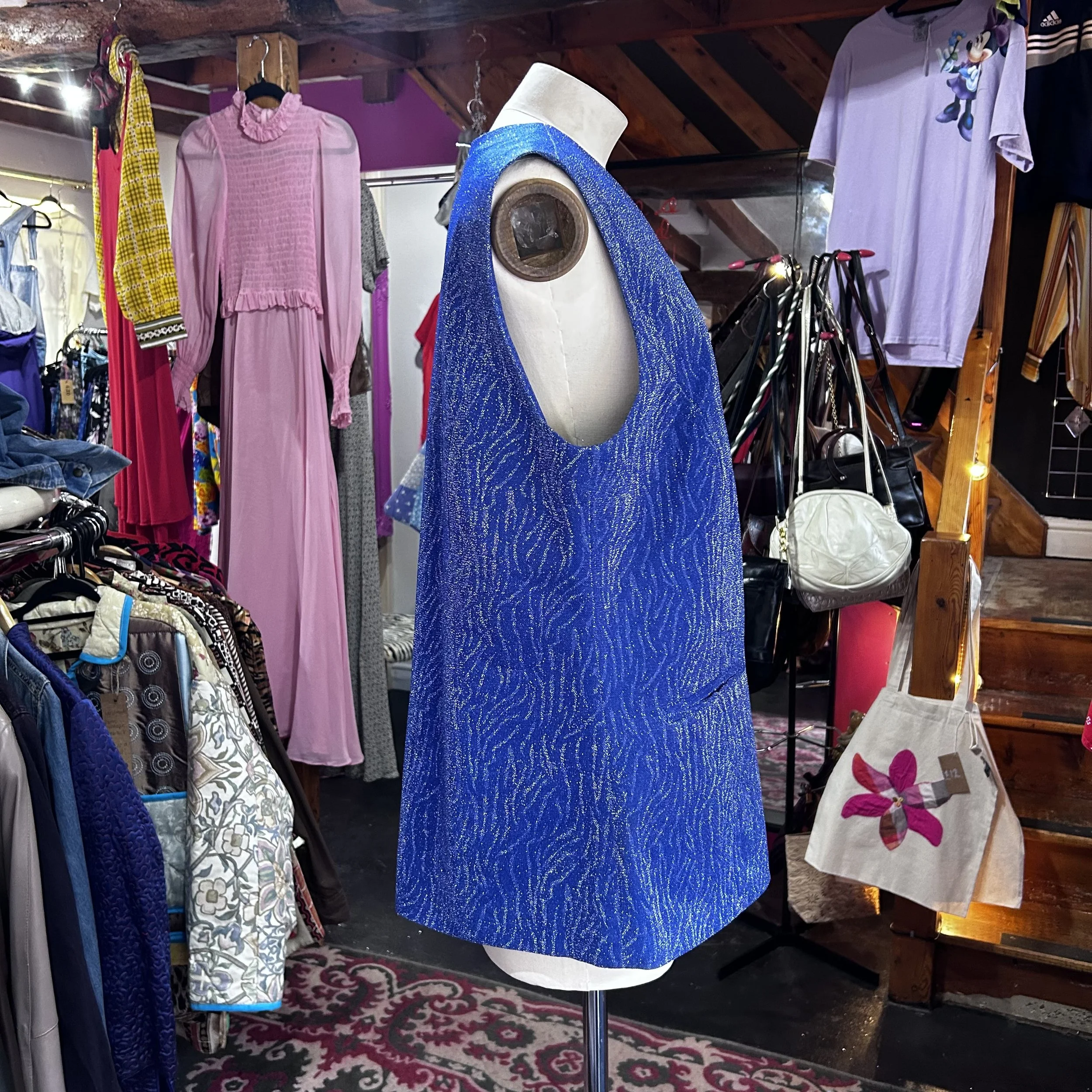 Striking vintage 70s waistcoat in a vivid cobalt blue with metallic silver thread woven throughout for a shimmering finish.