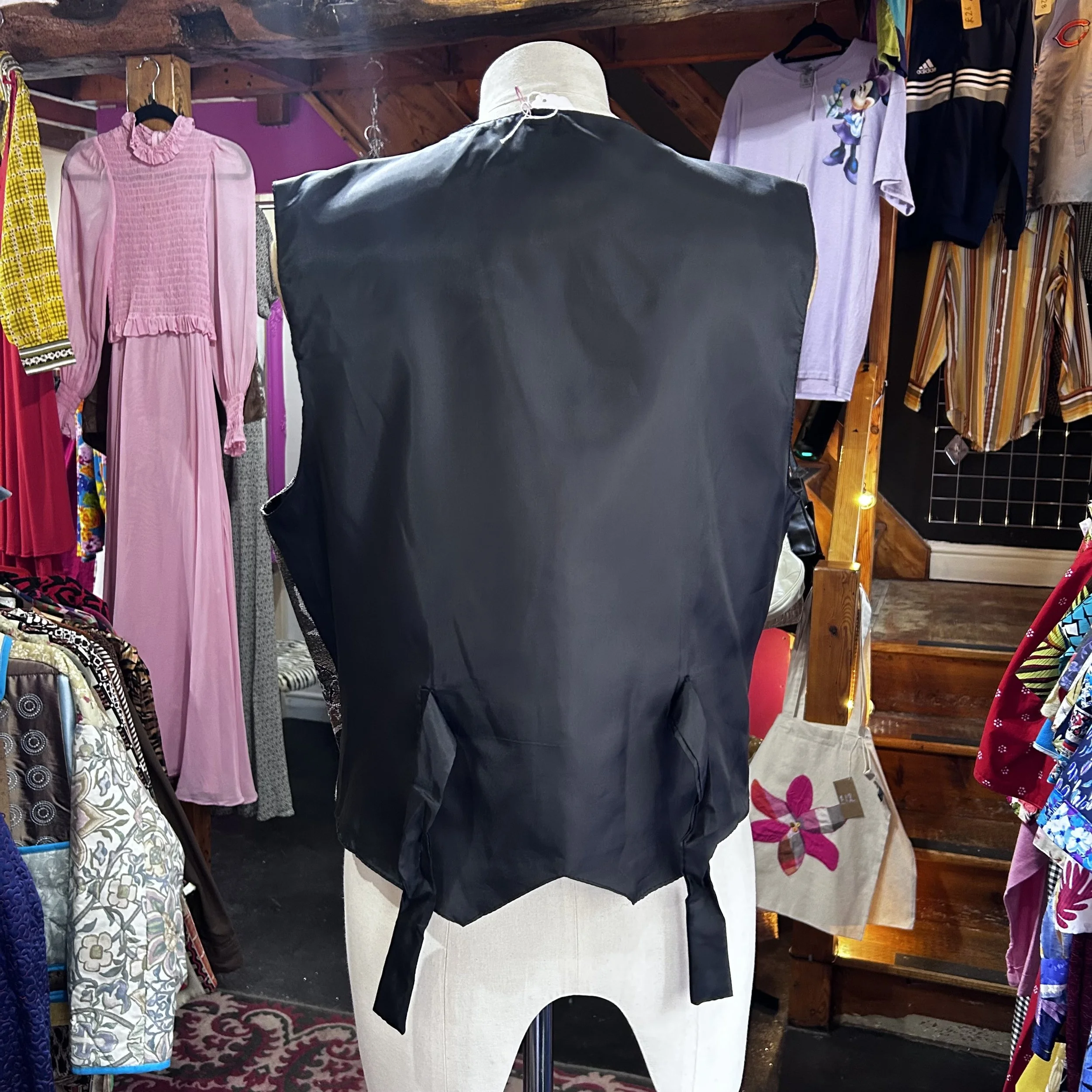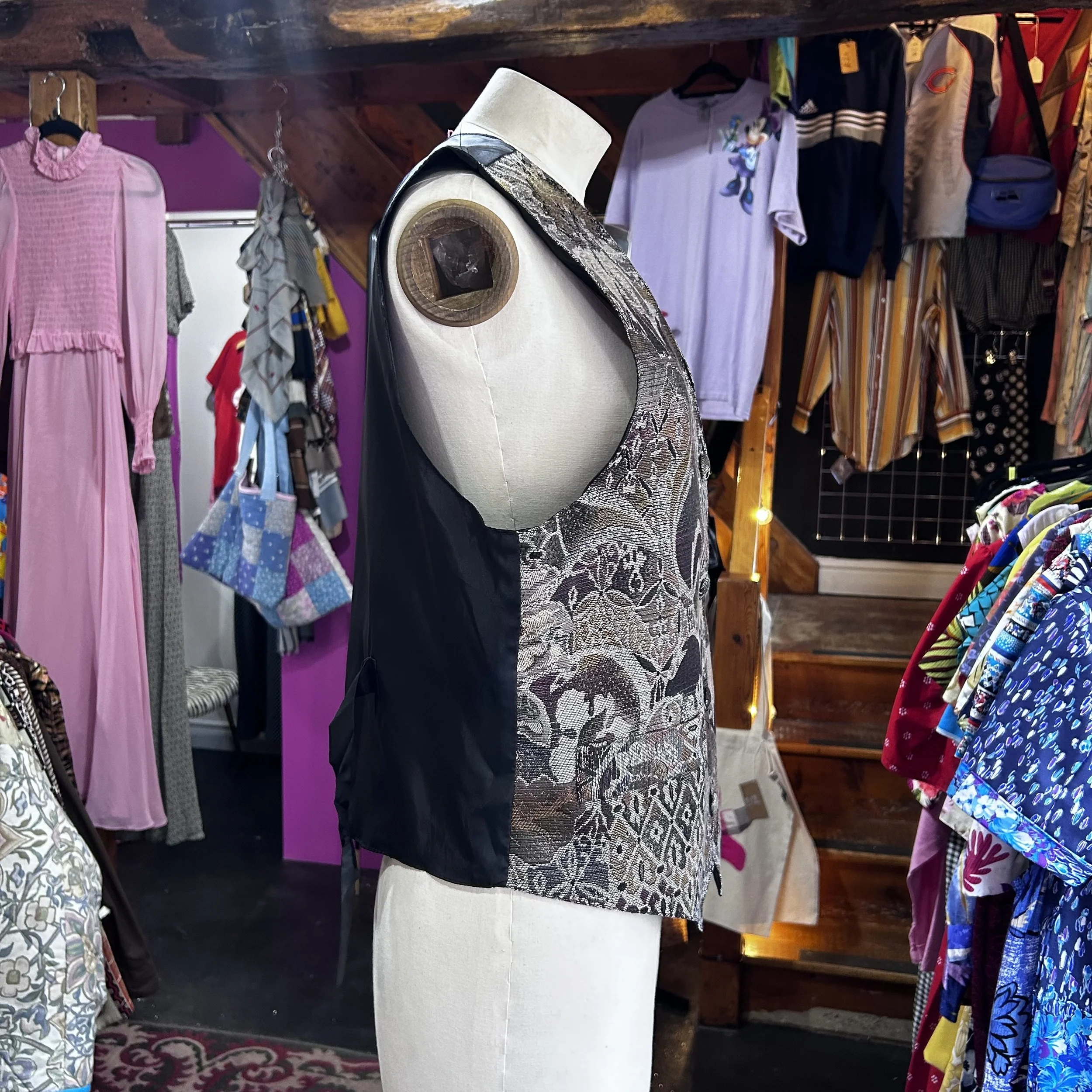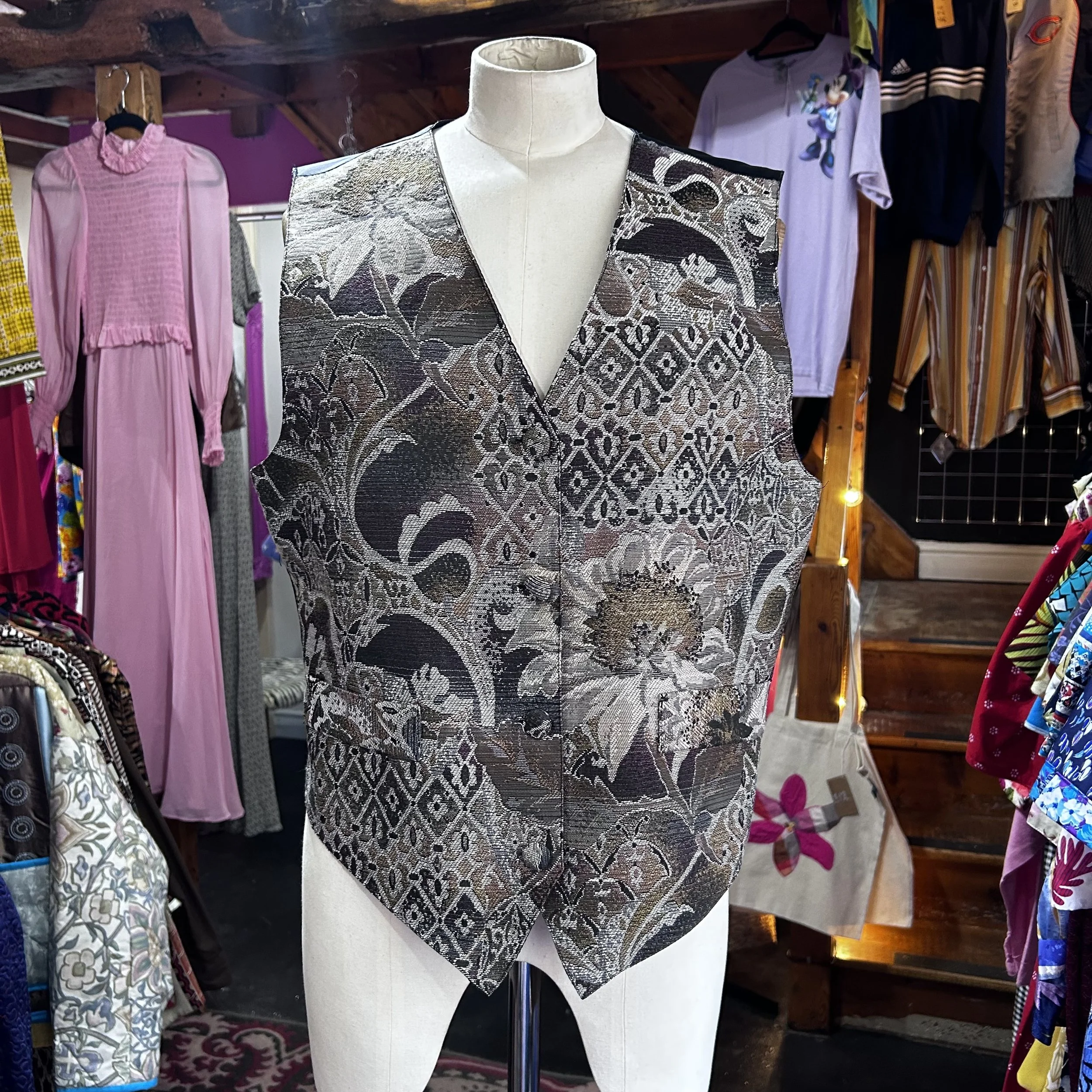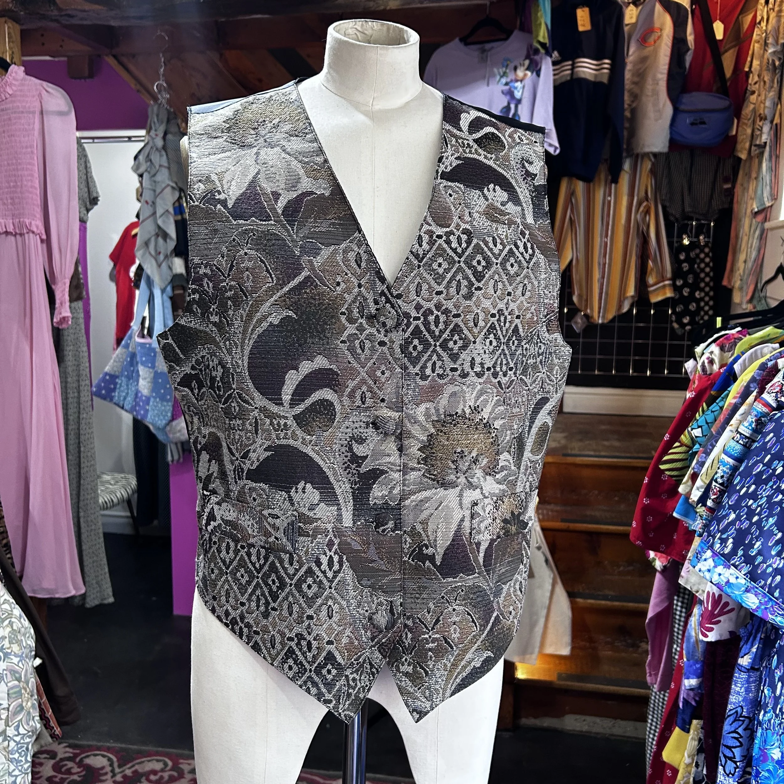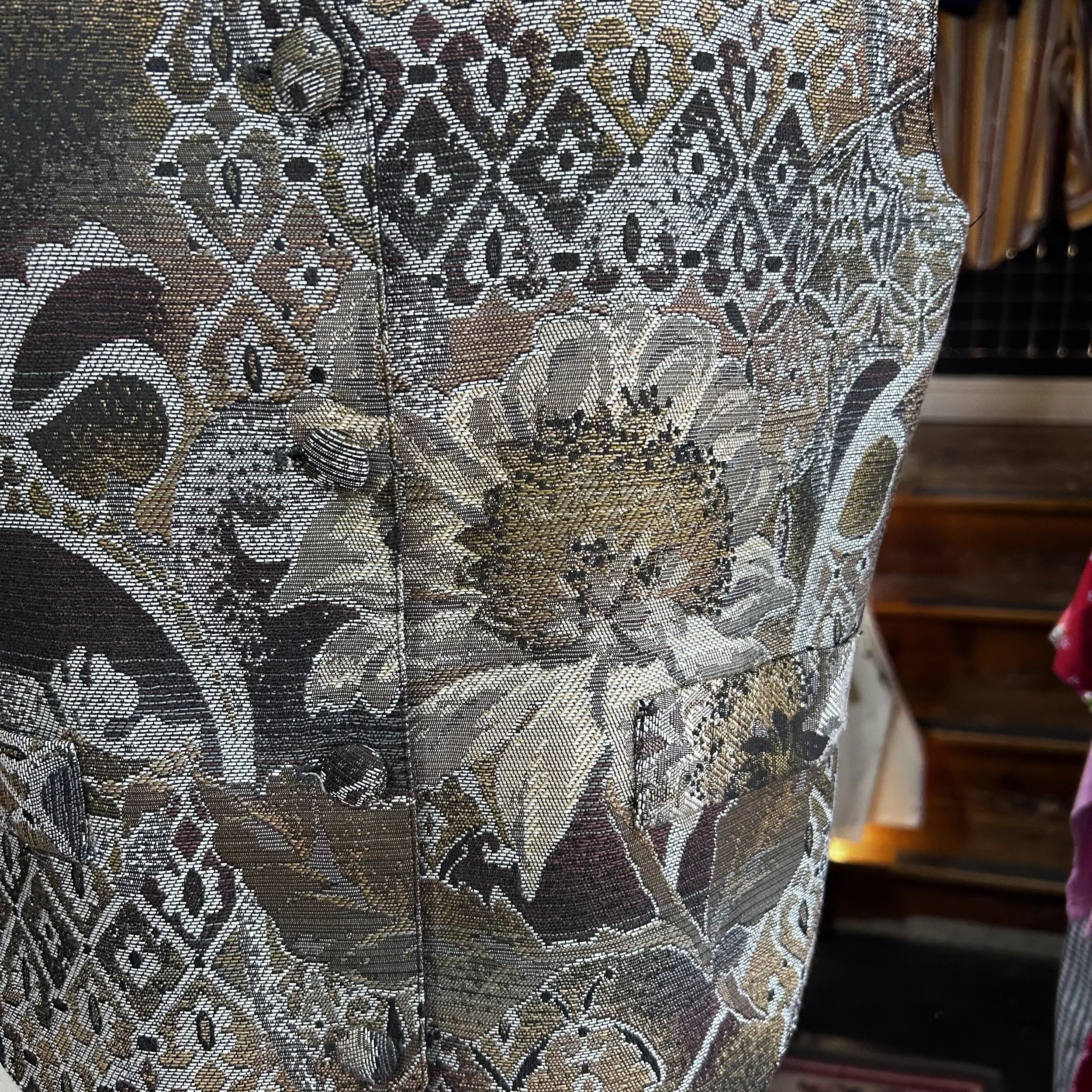 Vintage tapestry waistcoat featuring an intricate monochrome floral and geometric weave in muted shades. Designed with a deep V-neckline, button front fastening, and adjustable back strap for a tailored fit.