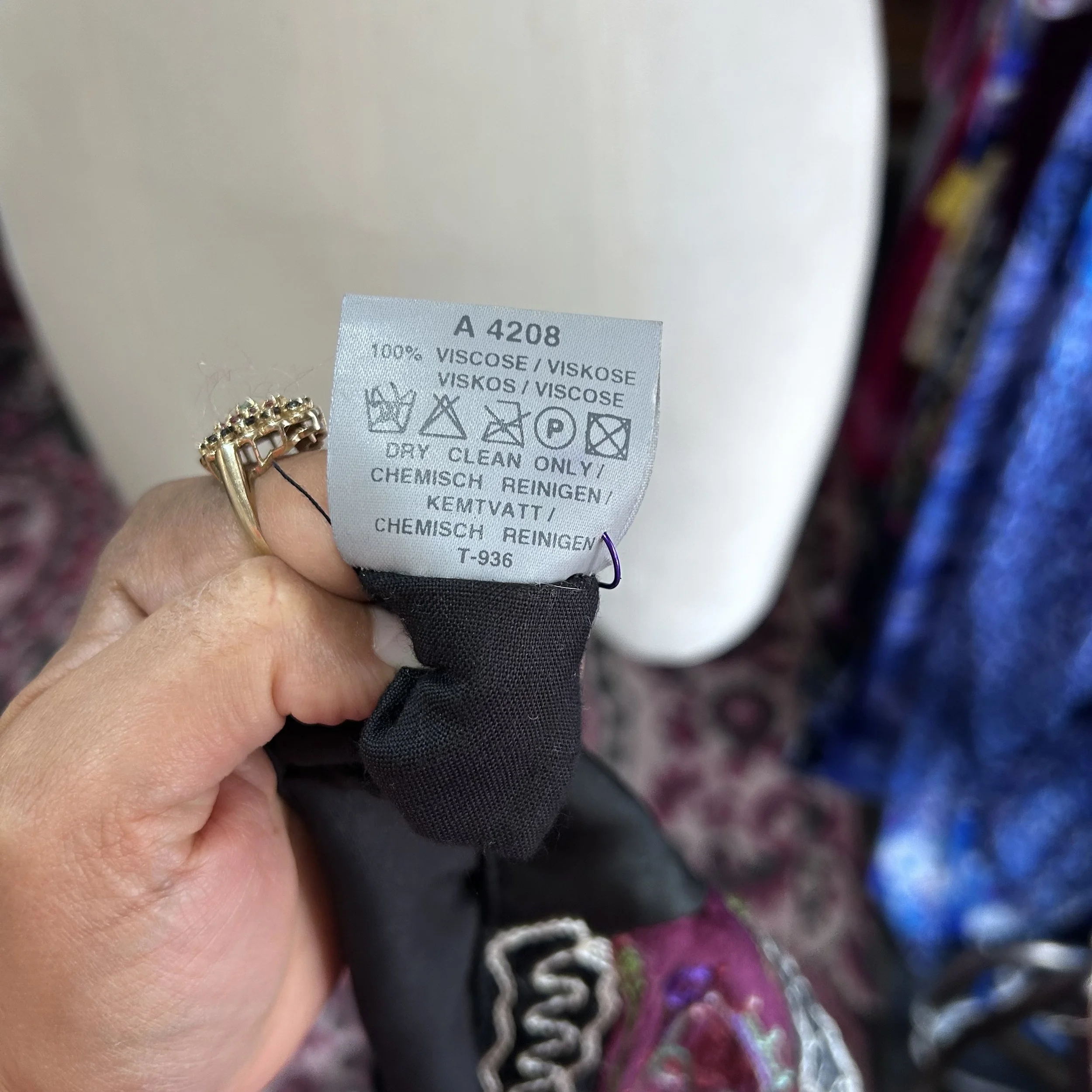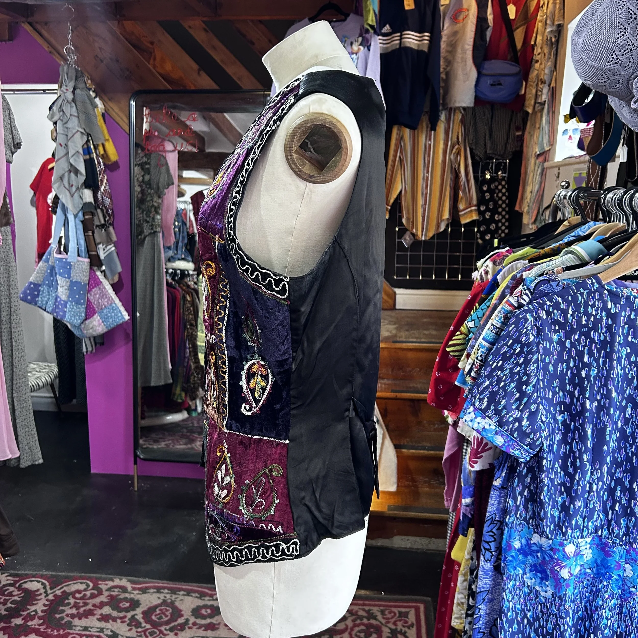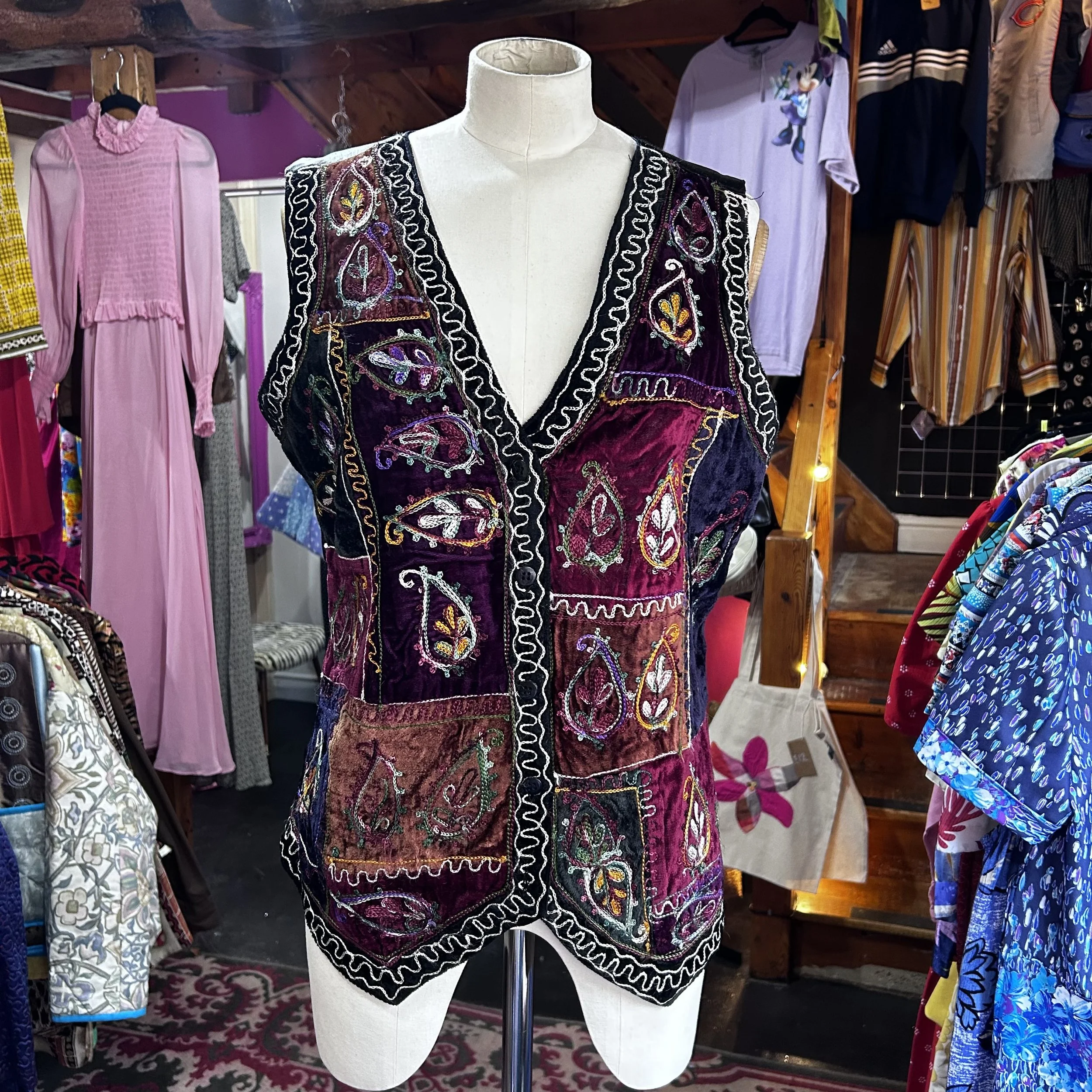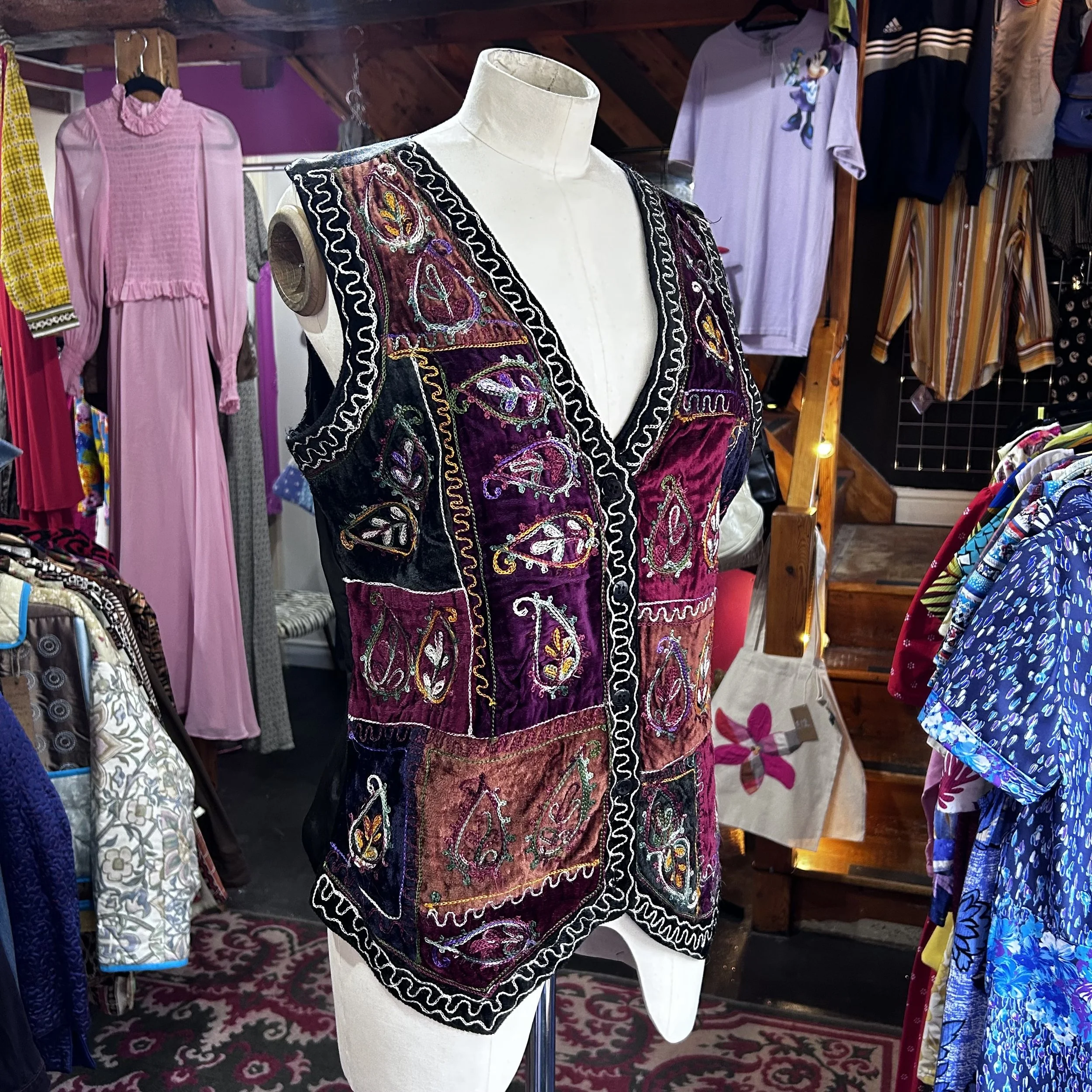 Boho vintage velvet waistcoat in rich jewel tones, decorated with embroidered paisley motifs and bead accents. The patchwork-style design blends deep purple, burgundy, and bronze, finished with a wavy embroidered trim. Fully lined in black with an adjustable back strap for a tailored fit.